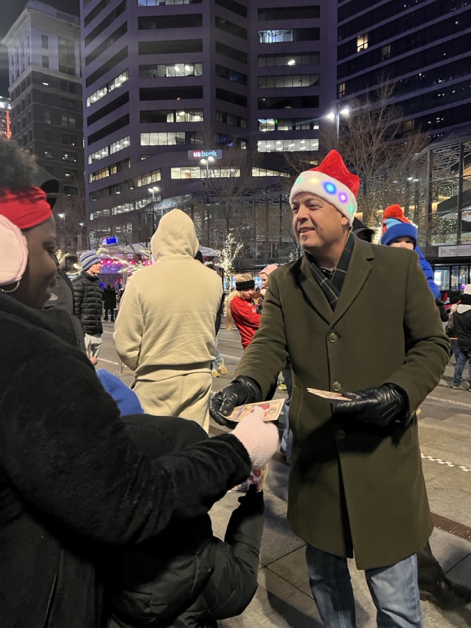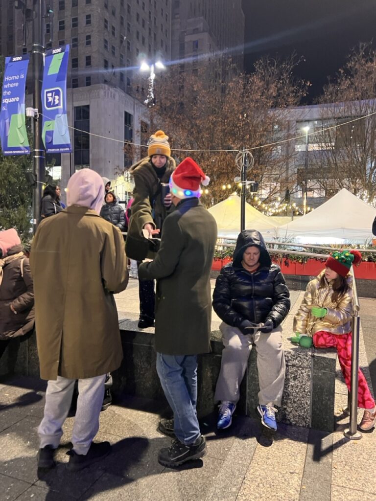 Our final outreach took us to the heart of downtown Cincinnati during the bustling Light Up the Square celebration. The air was buzzing—ice skating, music, food vendors, and thousands of people ushering in the Christmas season.